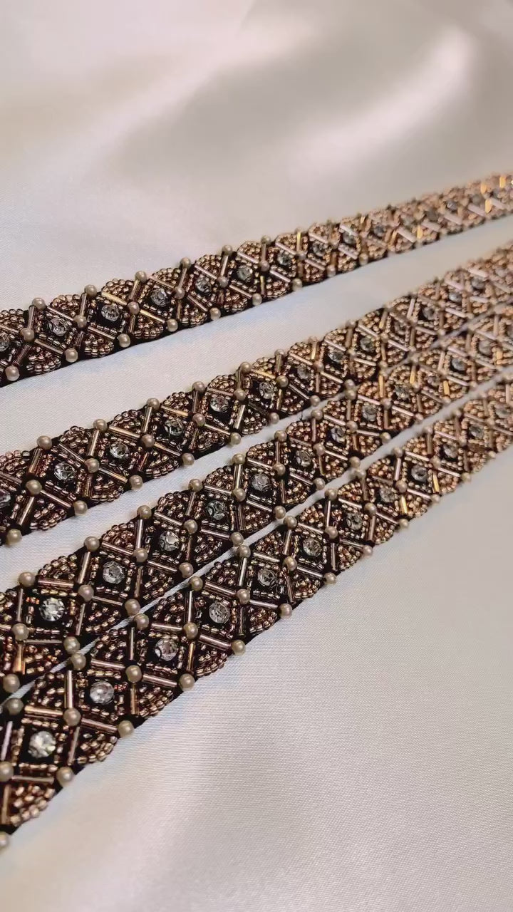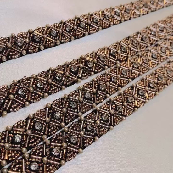Bandet har en rik kombination av brons och kopparfärger, kompletterat med skimrande strass och kristaller. Denna blend av material och färger skapar en känsla av vintage charm, vilket gör detta band till ett perfekt val för sofistikerade hantverksprojekt.